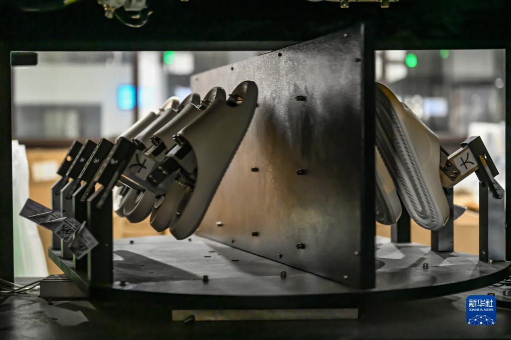 5月12日,在福建省晋江市茂泰鞋材有限公司的智能化生产车间,鞋子被运送到3D激光打印机内作业。