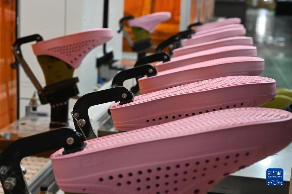 5月12日,在福建省晋江市茂泰鞋材有限公司的智能化生产车间,鞋子在自动化流水线上传送。