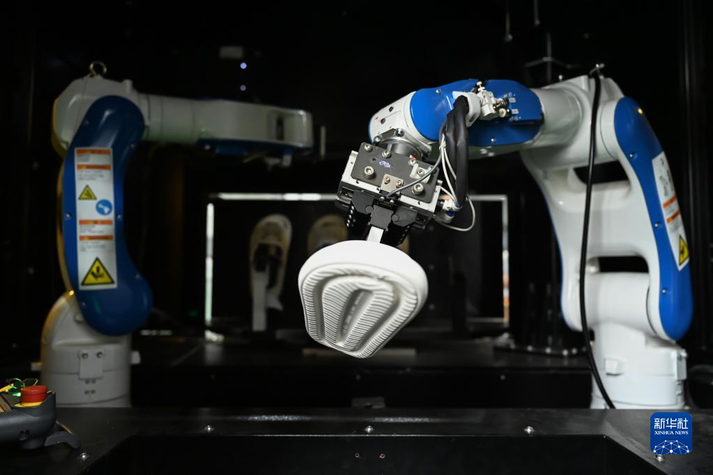 5月12日,在福建省晋江市茂泰鞋材有限公司的智能化生产车间,3D激光打印机在鞋面作业。
