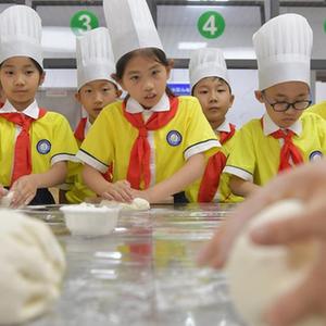 在江西省赣州市蓉江新区武陵小学,学生在烹饪课上学习如何擀面(5月11日摄)。