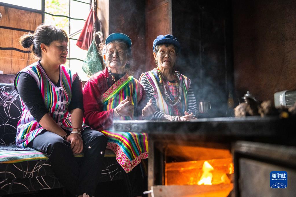 5月10日,在独龙江乡迪政当村,独龙族老人李文仕(中)和家人坐在火塘边聊天。