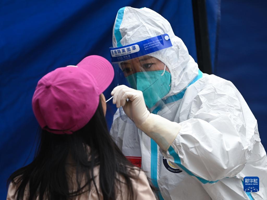 5月13日,在西宁市城西区新宁广场核酸采样点,医务人员为市民进行核酸采样。