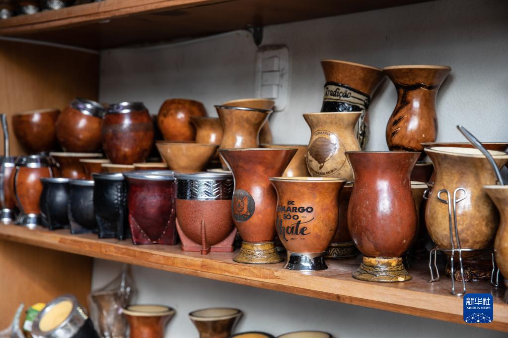 这是5月12日在巴西南大河州格拉马杜一家商店内拍摄的马黛茶茶具。
