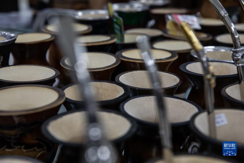 这是5月12日在巴西南大河州南卡希亚斯一家商店内拍摄的马黛茶茶具。