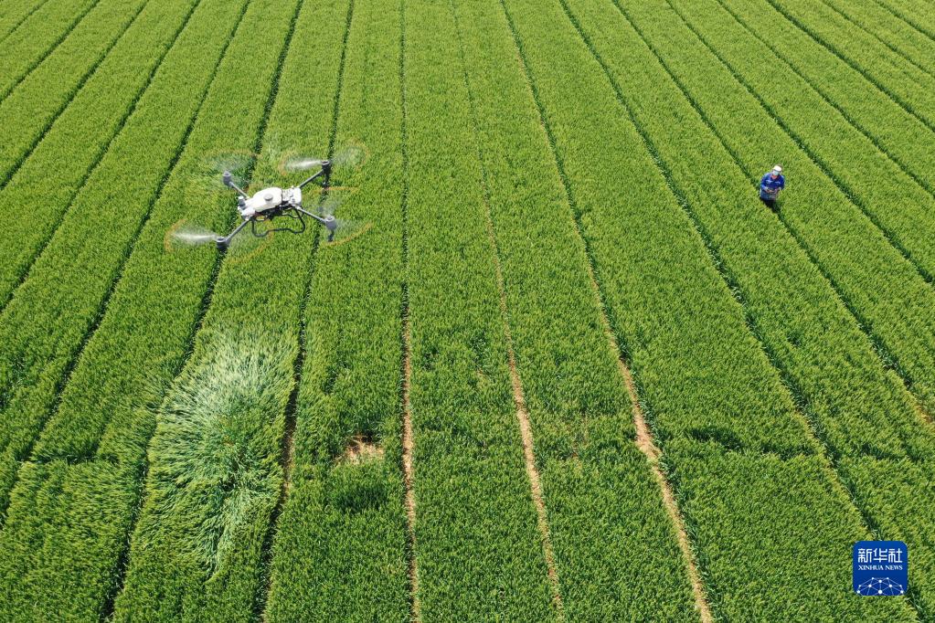 5月13日,焦作市温县武德镇宋冯蔺村农民操作无人机在麦田间开展“一喷三防”(无人机照片)。