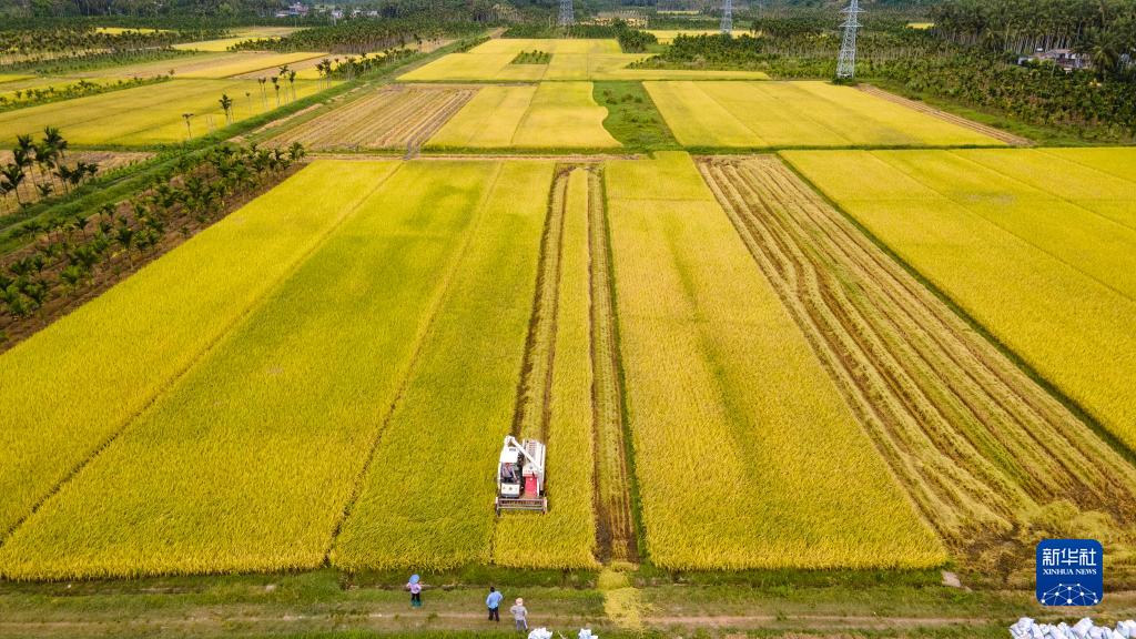 5月13日,海南省琼海市博鳌镇北山村的农民在抢收早稻(无人机照片)。