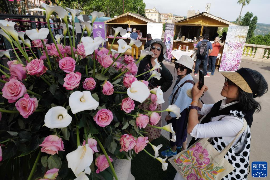 5月13日,人们在法国南部小城格拉斯街头欣赏鲜花。