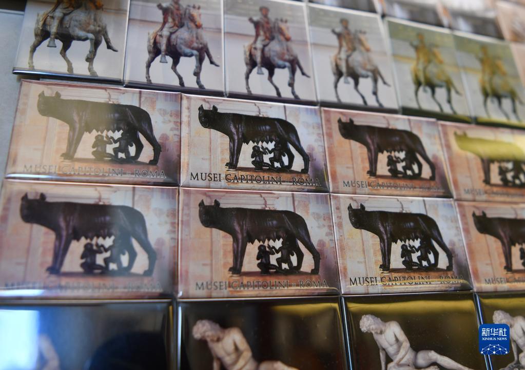 这是5月13日在意大利罗马卡皮托林博物馆拍摄的印有藏品“母狼乳婴”铜像的冰箱贴。
