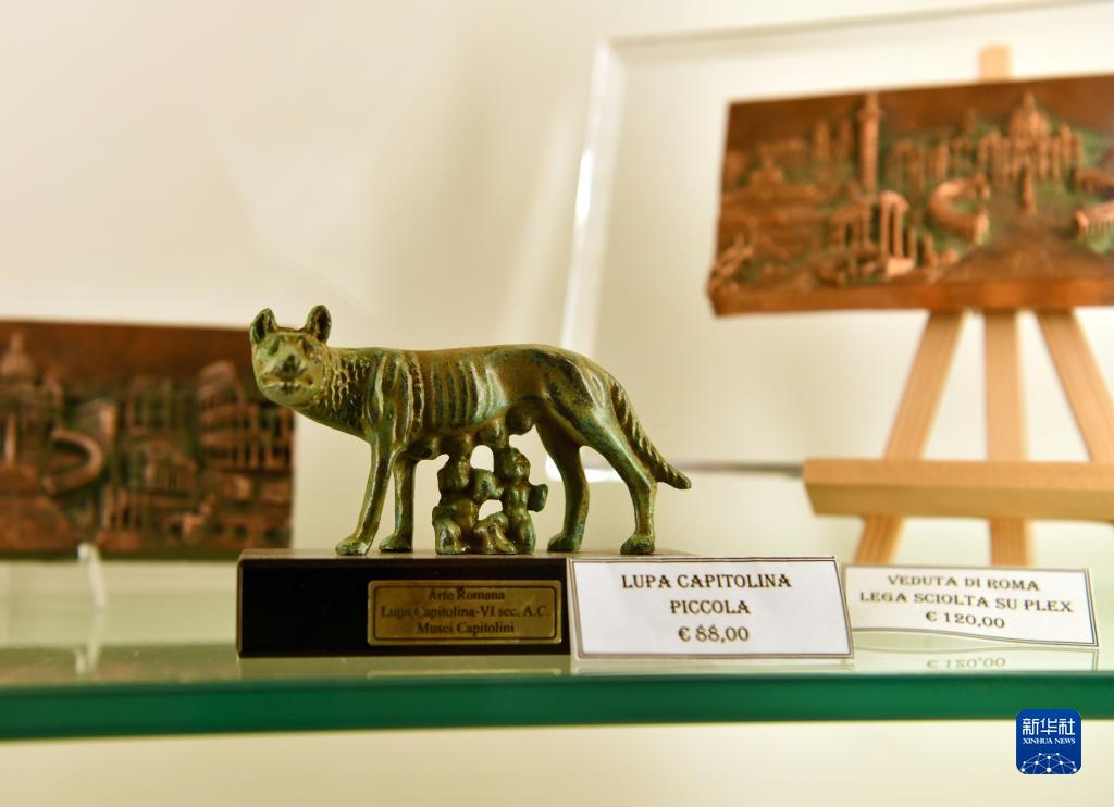 这是5月13日在意大利罗马卡皮托林博物馆拍摄的以藏品“母狼乳婴”铜像为原型的摆件。