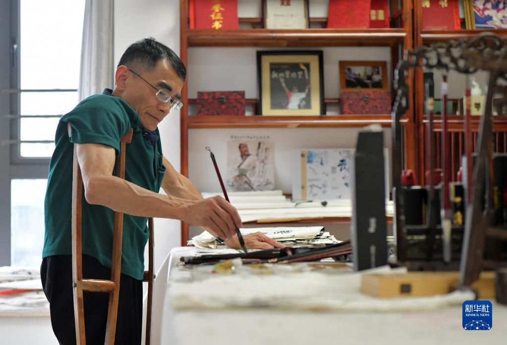 在位于江西省赣州市的工作室内,罗琪拄着双拐在创作漫画(5月10日摄)。