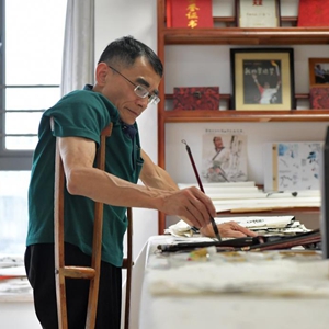 因患小儿麻痹症,58岁的罗琪从小失去了行走能力,日常生活只能依靠轮椅和双拐。12岁那年,罗琪因为一次美术作业完成出色得以在学校展出,这小小的荣誉成为了他梦想的起点。每天,罗琪用拐杖支撑着身体“站”着学画。因为肌肉萎缩乏力,脊柱弯曲,罗琪学起画来十分艰难,撑着双拐的腋下经常磨得红肿、出血,但他从未放弃梦想。
