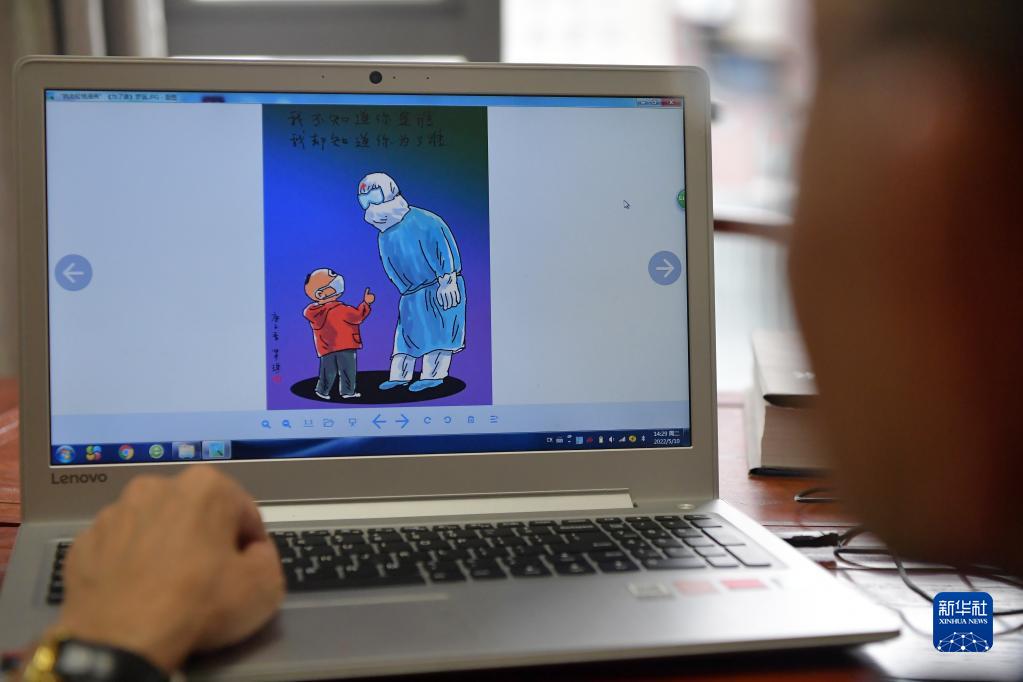 在位于江西省赣州市的工作室内,罗琪在展示他创作的抗疫漫画(5月10日摄)。新华社记者 彭昭之 摄