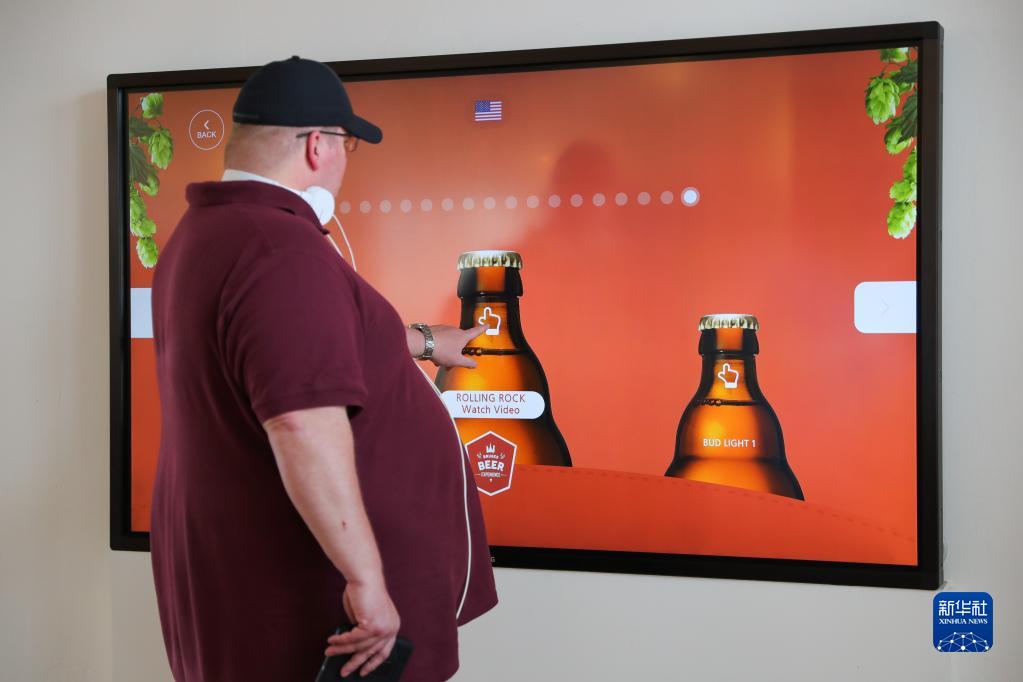 5月13日,一名游客在比利时布鲁日的“啤酒体验”博物馆使用互动屏幕了解啤酒知识。
