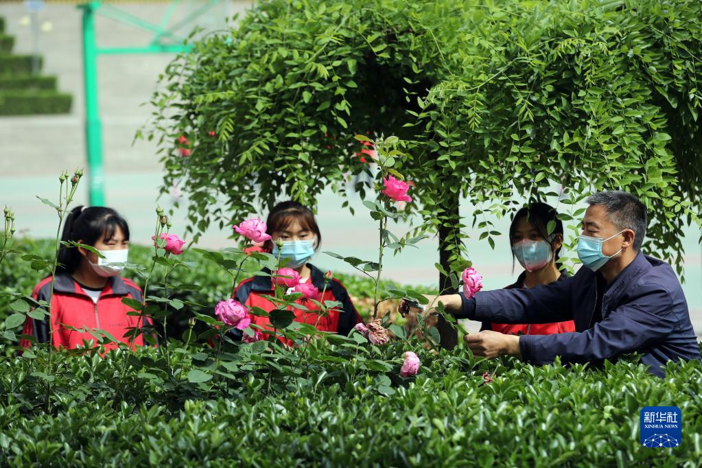 5月14日,在石家庄市井陉县职业技术教育中心,老师指导农林专业的学生学习花艺剪枝。