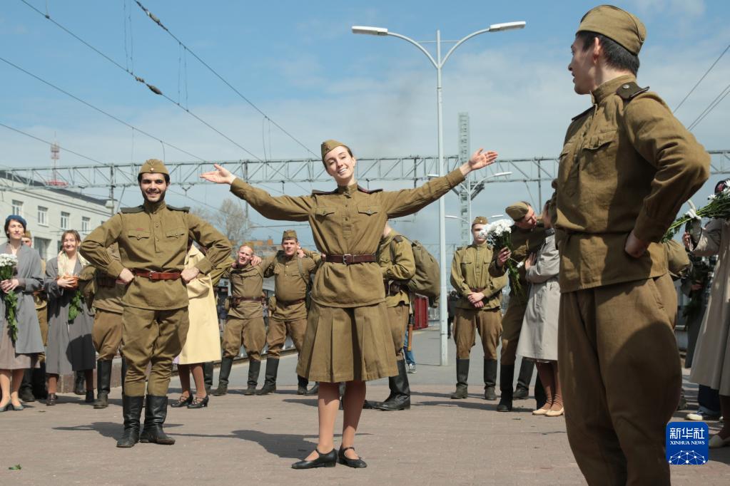 5月6日,参加纪念活动的人员在俄罗斯圣彼得堡芬兰火车站跳舞。