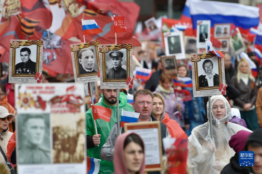 5月9日,在俄罗斯首都莫斯科,人们手持老战士照片参加“不朽军团”游行。