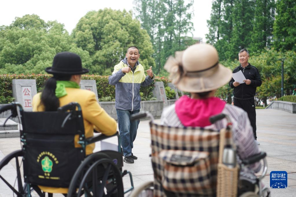 5月11日,在南京鼓楼广场,朱光俊(左二)带领残疾人排练情景诗朗诵《心窗》。