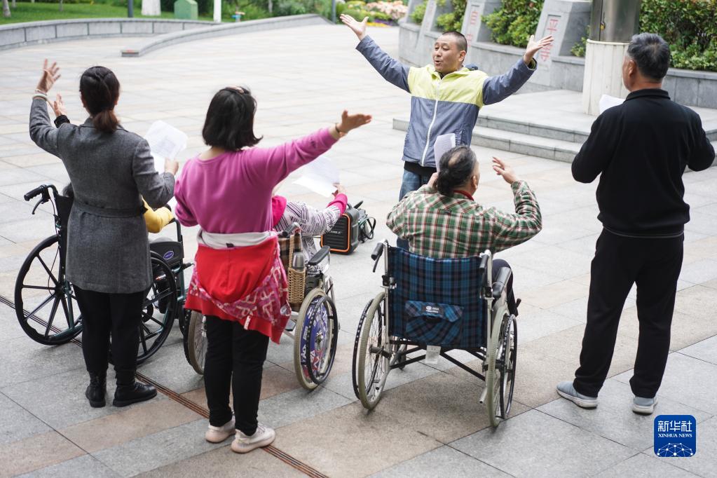 5月11日,在南京鼓楼广场,朱光俊(右三)带领残疾人排练情景诗朗诵《心窗》。