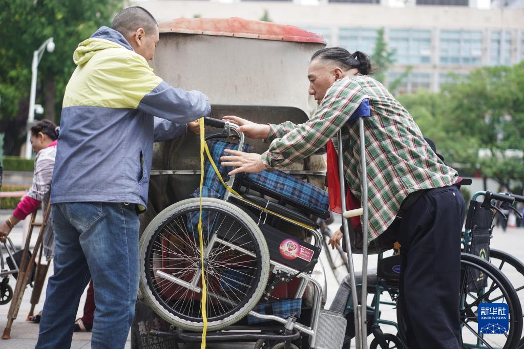 5月11日,在南京鼓楼广场,朱光俊帮助结束排练的残疾人收拾轮椅,准备回家。