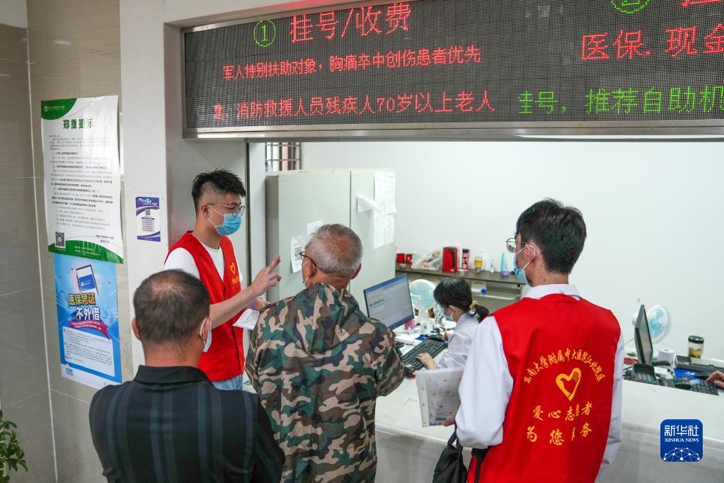 在东南大学附属中大医院江北院区,陈鑫(左一)和志愿者陪伴听障人士老陈(右二)挂号就医(5月9日摄)。