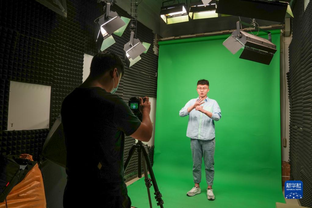 陈鑫在南京科技职业学院录制疫情防控知识手语翻译视频(5月9日摄)。