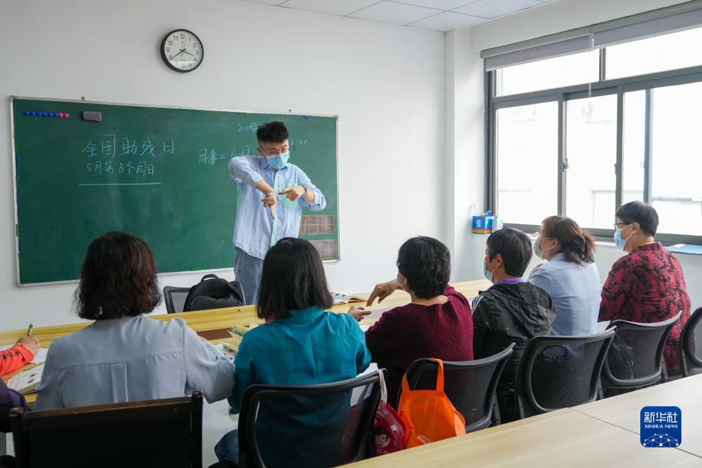 在南京江北新区大厂街道新庄社区党群服务中心,陈鑫为社区志愿者开展手语培训(5月9日摄)。