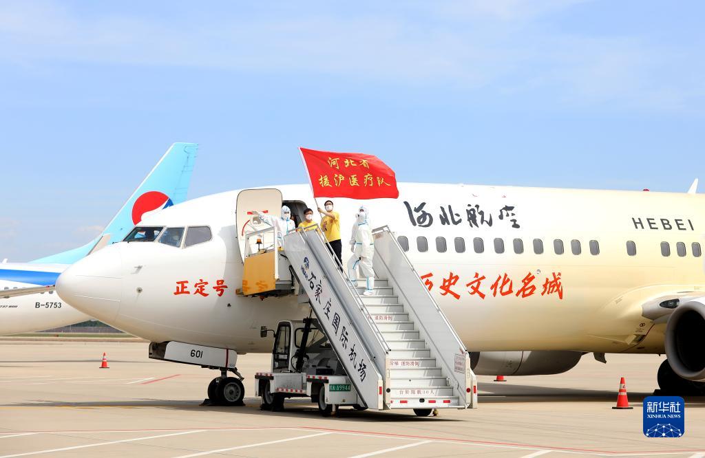 5月14日,在石家庄正定国际机场停机坪,河北省援沪医疗队队员走出机舱。