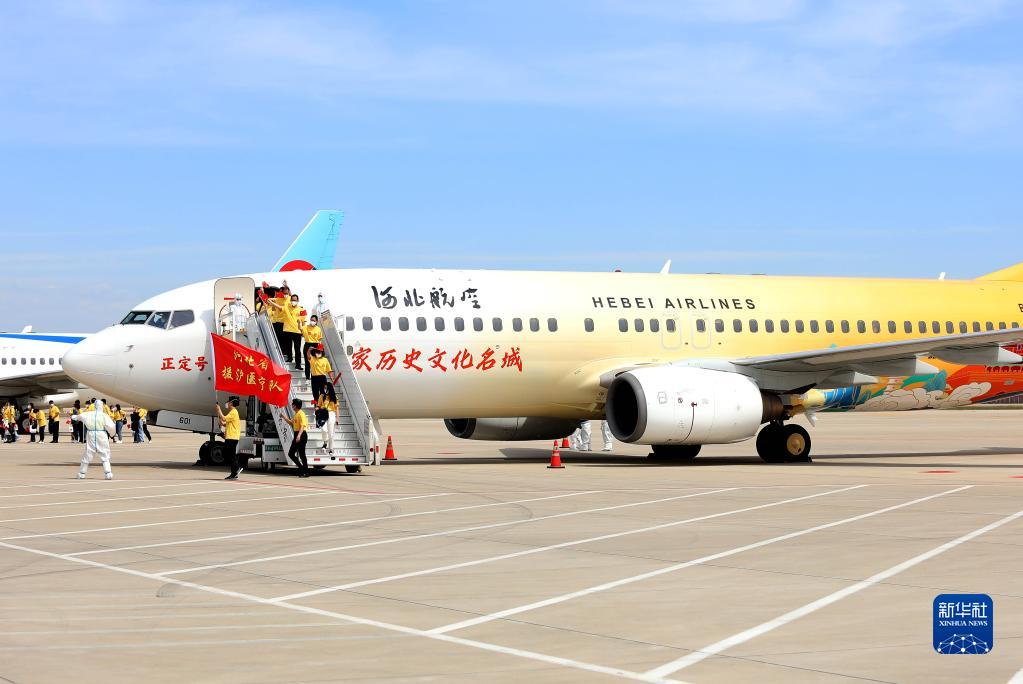 5月14日,在石家庄正定国际机场停机坪,河北省援沪医疗队队员走下飞机。