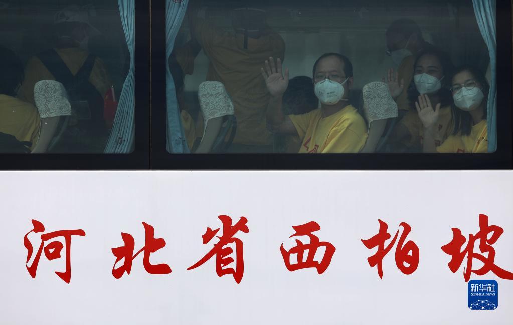 5月14日,在石家庄正定国际机场,河北省援沪医疗队队员在大巴上挥手致意。