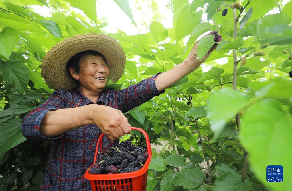 5月14日,在合肥市蜀山区小庙镇枣林生态园,村民在桑葚园里采摘桑葚。