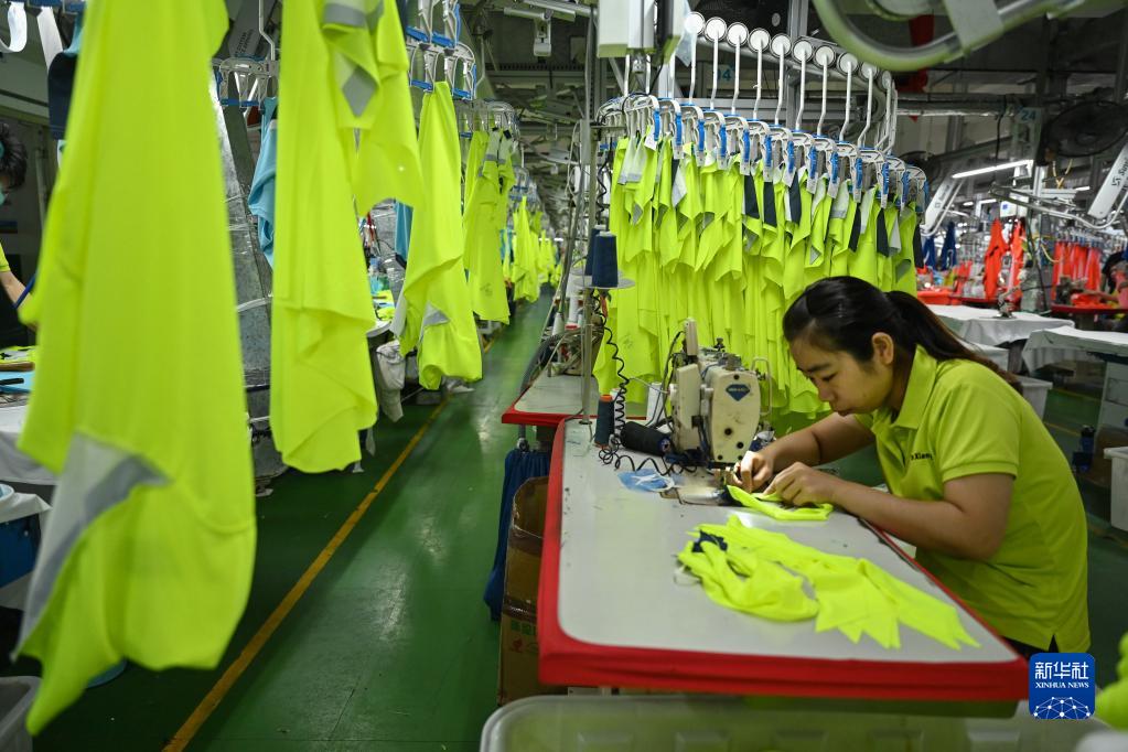 5月13日,在福建省晋江市卡尔美运动服装生产车间,工人在赶订单。