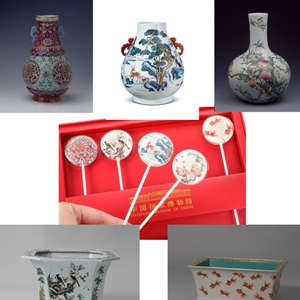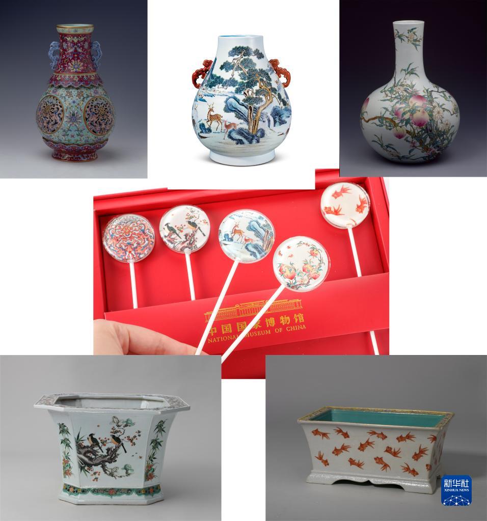 左上为清代粉彩镂空夔龙纹转心瓶,上中为清代粉彩鹿纹尊,右上为清代粉彩桃纹天球瓶,左下为清代五彩花鸟纹八方花盆,右下为红彩金鱼纹长方形花盆,中为以文物图案为主题设计的甜蜜棒棒糖礼盒(资料照片)。