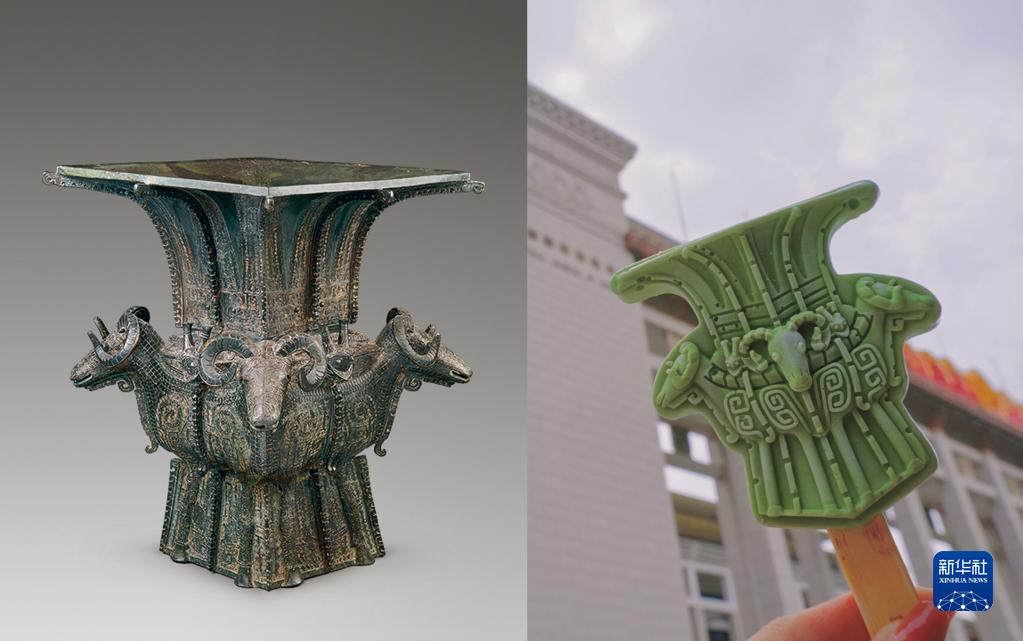 左图为商代青铜器四羊方尊,右图为抹茶四羊方尊雪糕(资料照片)。