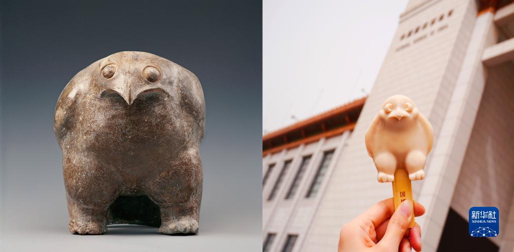 左图为仰韶文化鹰形陶鼎,右图为可可榛子鹰形陶鼎雪糕(资料照片)。