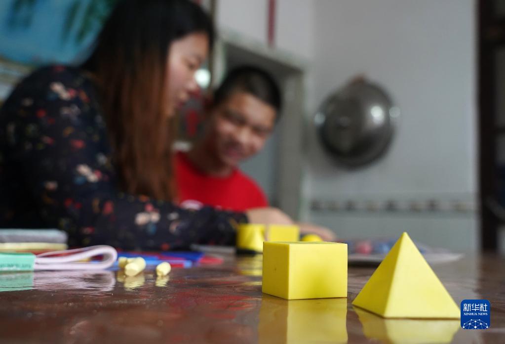 在江西省万安县百嘉镇百嘉村,送教老师郭万梅(左)在残疾学生小伟家中给他上数学课(5月12日摄)。小伟是一名精神三级残疾的学生,生活不能自理,无法入校进行正常学习。郭万梅在3年中坚持每星期两次送教上门,为小伟送上“一对一”的家庭课堂。从一开始抗拒教学,到现在盼着上课,小伟动手能力强了,性格也更开朗了。看到学生的成长,郭老师感到很欣慰。