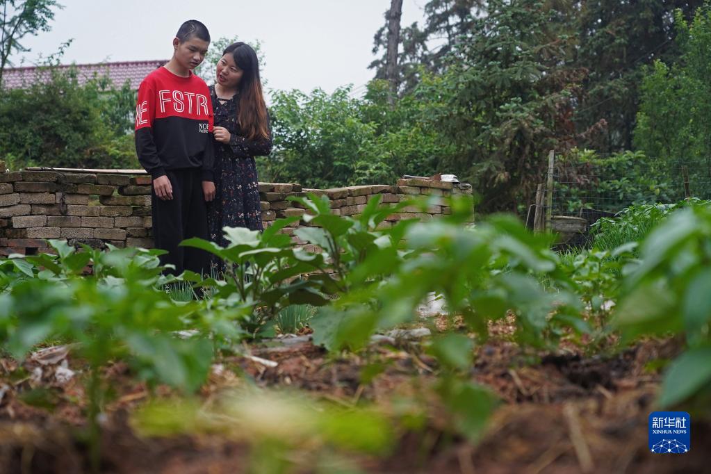 在江西省万安县百嘉镇百嘉村,送教老师郭万梅(右)在残疾学生小伟家的菜地旁教他认识蔬菜(5月12日摄)。小伟是一名精神三级残疾的学生,生活不能自理,无法入校进行正常学习。郭万梅在3年中坚持每星期两次送教上门,为小伟送上“一对一”的家庭课堂。从一开始抗拒教学,到现在盼着上课,小伟动手能力强了,性格也更开朗了。看到学生的成长,郭老师感到很欣慰。