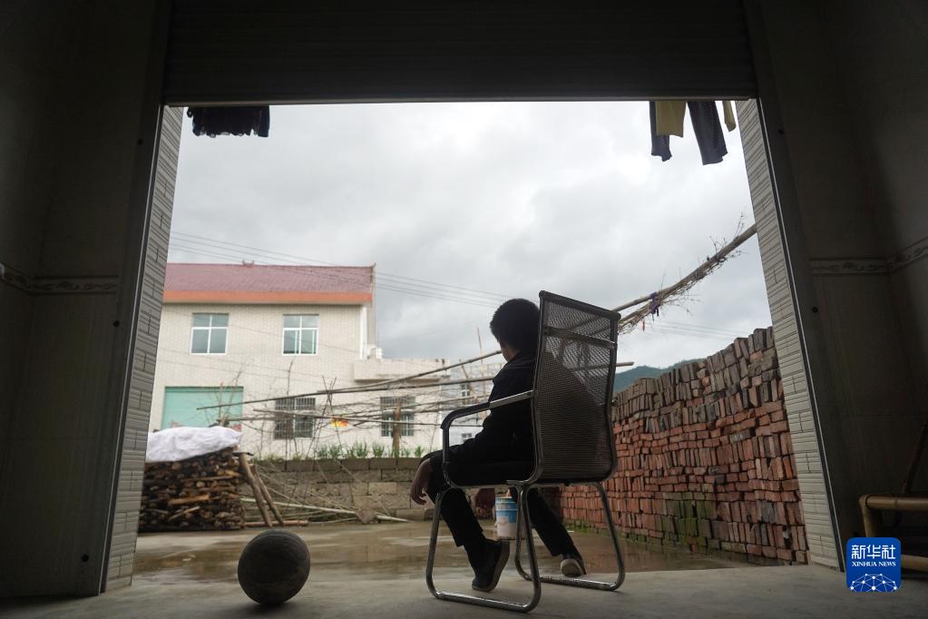 在江西省万安县宝山乡黄塘村,行动不便的小翔坐在家门口等待送教的老师(5月13日摄)。江西省万安县宝山中学的赵珑娟老师给肢体一级残疾的小翔送教约一年半时间。在她的努力下,小翔终于能写下几个简单的汉字。为了鼓励学生的进步,赵老师每次送教,都会带一些零食和文具作为奖励。