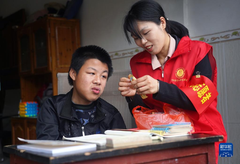 在江西省万安县宝山乡黄塘村,送教老师赵珑娟(右)给小翔带来零食作为奖励(5月13日摄)。江西省万安县宝山中学的赵珑娟老师给肢体一级残疾的小翔送教约一年半时间。在她的努力下,小翔终于能写下几个简单的汉字。