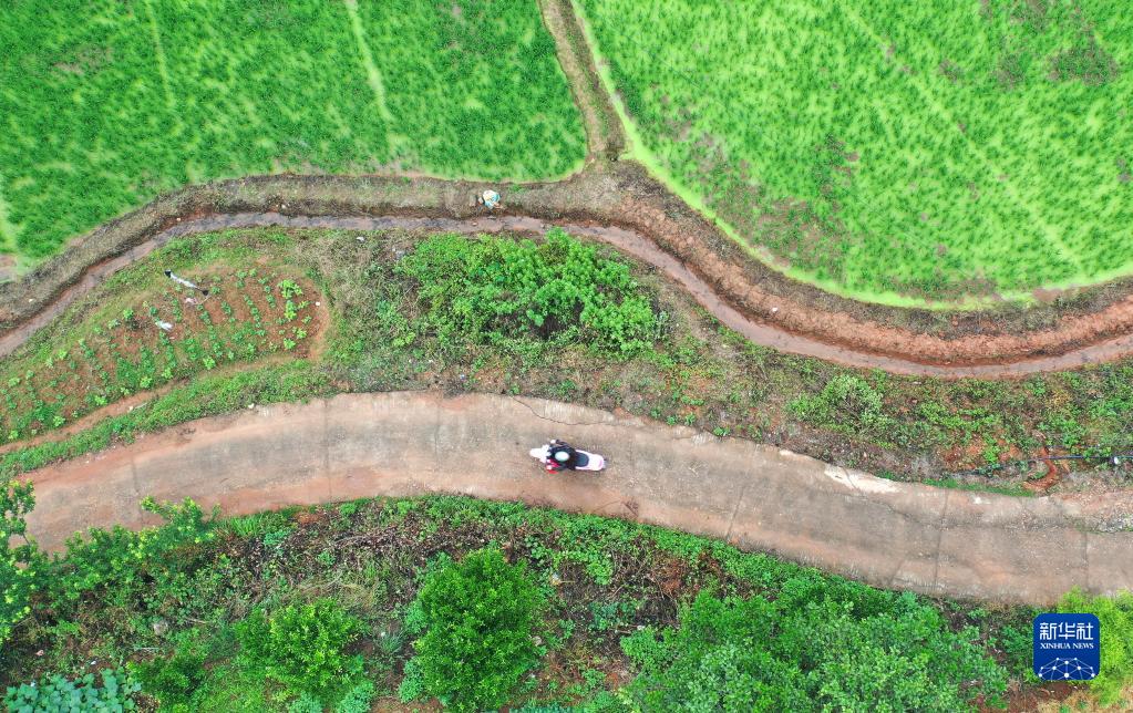 江西省万安县百嘉中学老师郭万梅骑着电动车,前往残疾学生家中送教上课(5月12日摄,无人机照片)。
