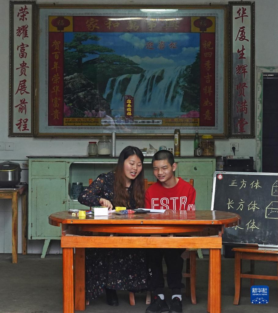 在江西省万安县百嘉镇百嘉村,送教老师郭万梅(左)在残疾学生小伟家中给他上数学课(5月12日摄)。小伟是一名精神三级残疾的学生,生活不能自理,无法入校进行正常学习。郭万梅在3年中坚持每星期两次送教上门,为小伟送上“一对一”的家庭课堂。从一开始抗拒教学,到现在盼着上课,小伟动手能力强了,性格也更开朗了。看到学生的成长,郭老师感到很欣慰。