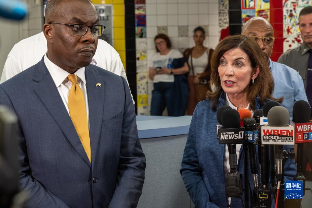 5月14日,美国纽约州长凯茜·霍楚尔(前右)在布法罗市出席新闻发布会,介绍枪击事件相关情况。