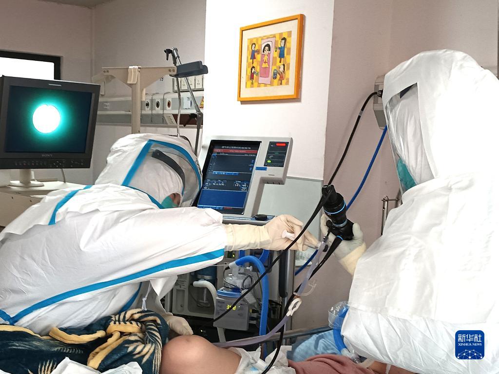 4月27日,在上海复旦大学附属儿科医院儿童重症监护室,医护人员给甜甜做治疗(手机拍摄)。
