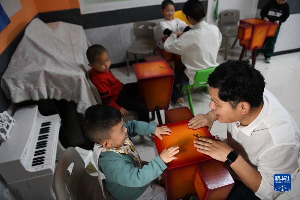 5月13日,在合肥市蜀山区春语儿童康复中心,岳雷(前右)在给孤独症孩子上音乐课。