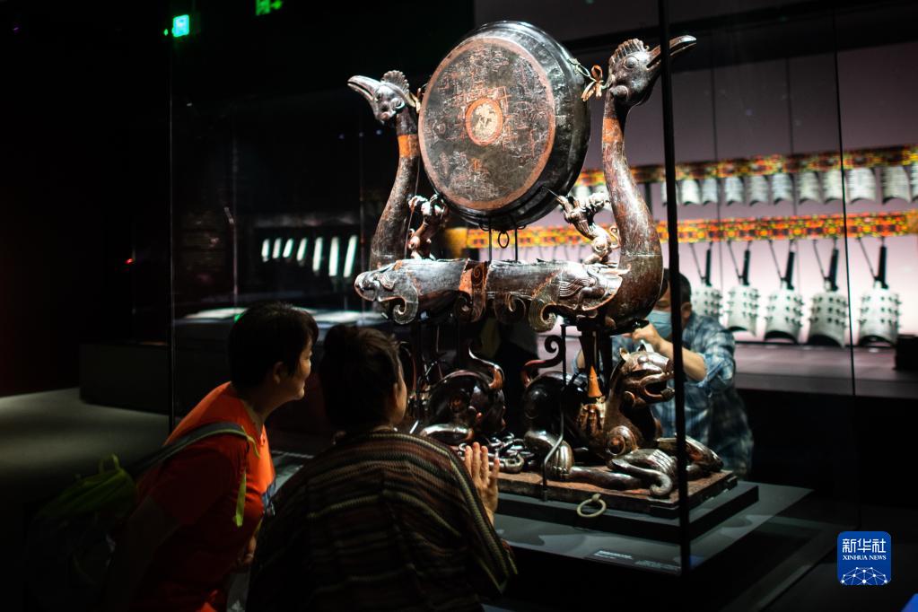 5月12日,参观者观看展出的彩绘漆木虎座鸟架鼓。