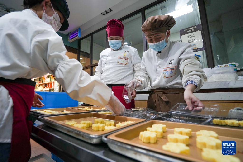 5月10日,“喜憨儿”们在爱德面包坊制作、分装绿豆糕。