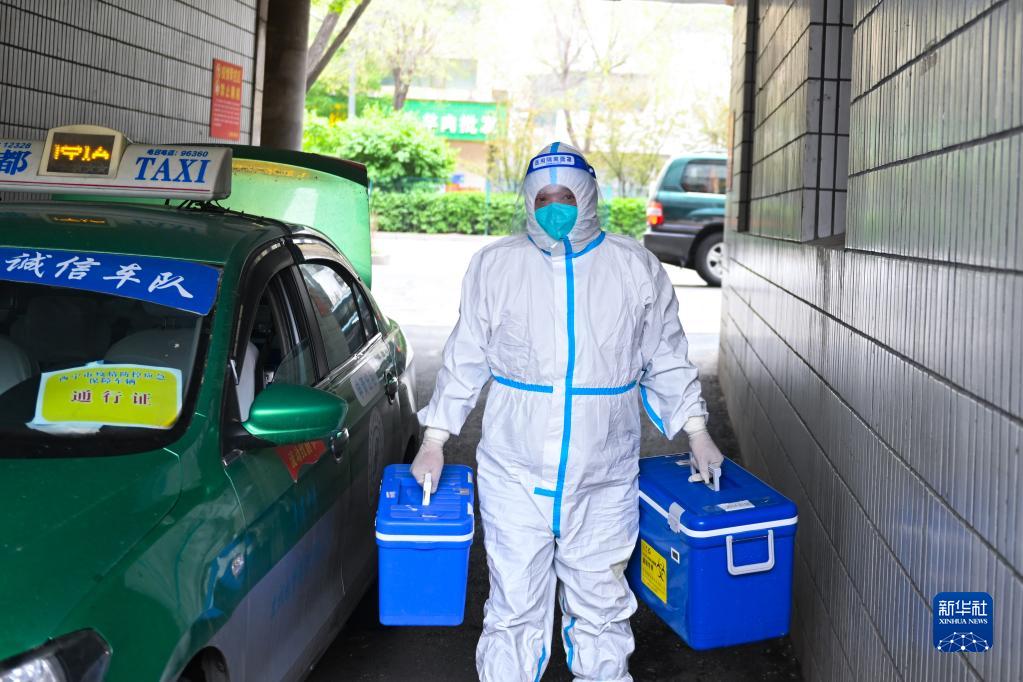 5月14日,王振民在青海省西宁市城西区一处社区搬运核酸检测样本箱。