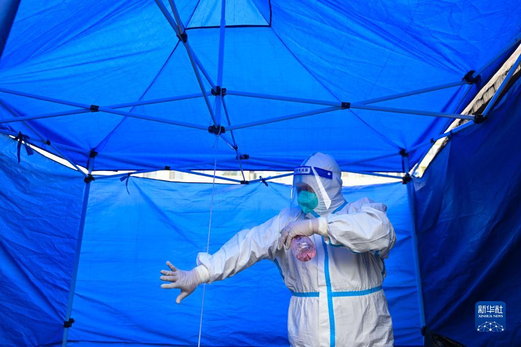 5月14日,王振民在完成当日转运核酸检测样本的工作之后进行消杀。