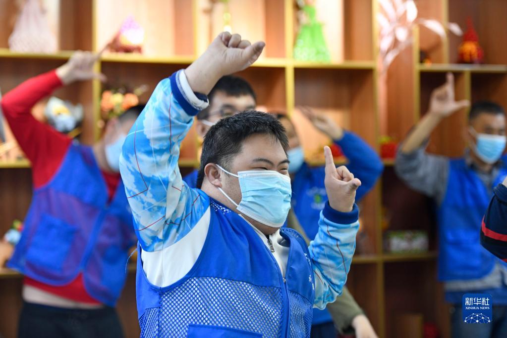 在天津市和平区的爱众残疾人阳光工场,残障学员在练习健身操(5月13日摄)。
