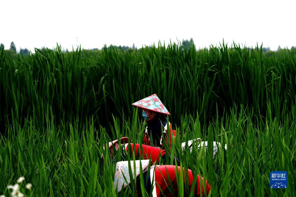 5月15日,上海青浦区练塘镇茭农在茭白种植基地里劳作。