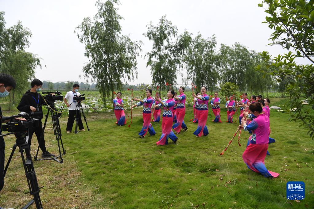 5月15日,肥西县柿树岗乡村民通过“云上”直播表演当地传统非遗文化项目莲湘舞。